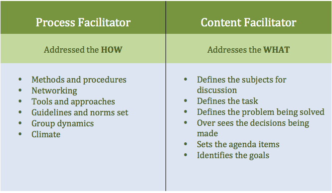 There are two general types of facilitators: process facilitators and content facilitators. An innovative organization needs leaders who are creative and focused to work towards a set of core values that are consistent with the concepts of collaboration, learning and partnership, empowerment and commitment. This type of facilitator uses core values and principles to drive their role as a “facilitative leader.” A process facilitator and a content facilitator will have the same core values, but apply them differently according to their roles. Most facilitative leaders are people leading teams or directing and managing their own units. Hence, they have more authority to make decisions for their group while serving as facilitator during meetings or planning sessions.